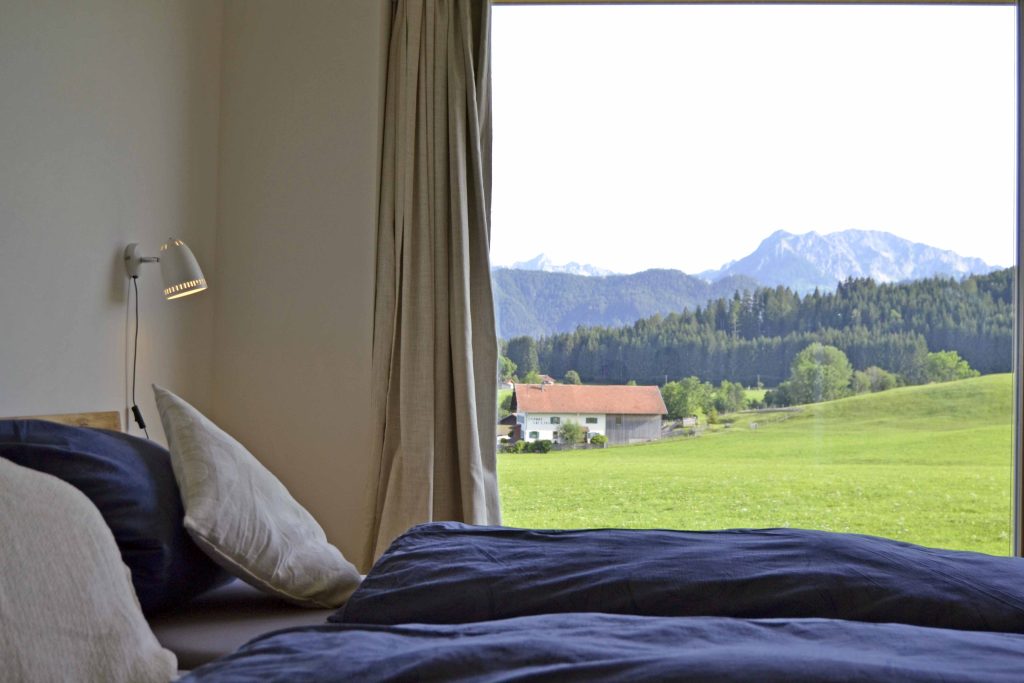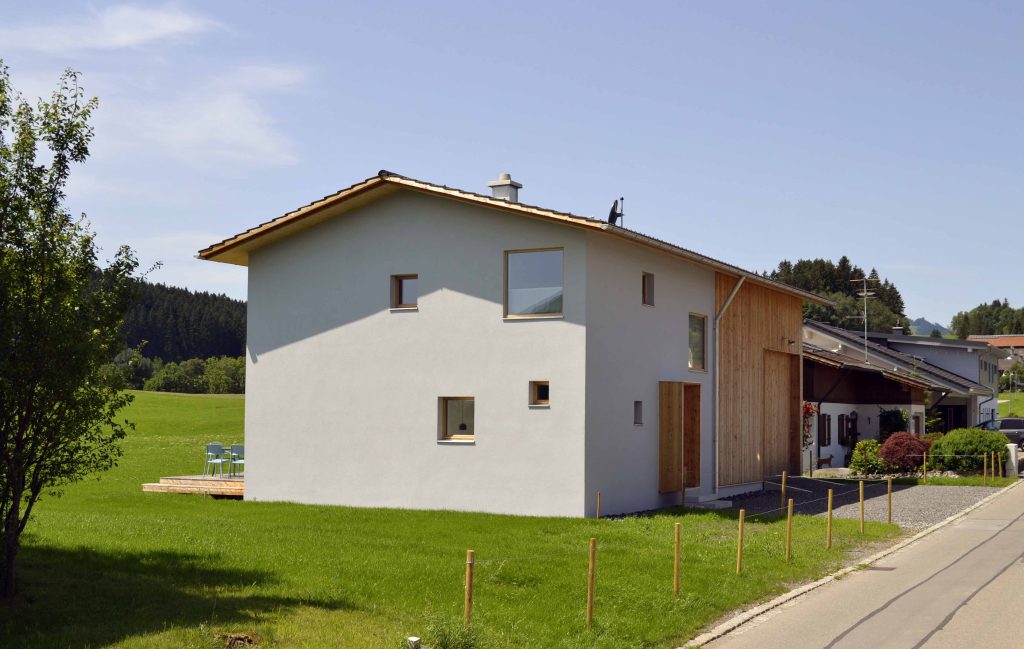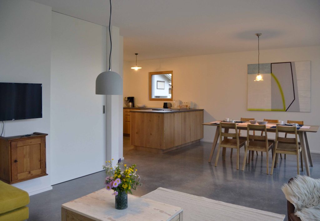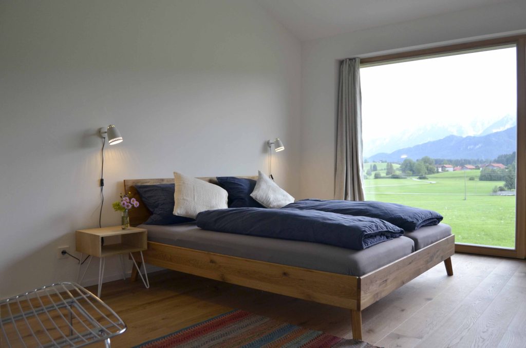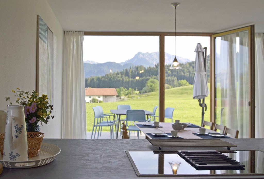 Moderne Architektur trifft traditionelle Allgäuer Baukultur! … Das ist das HAUS mit WEITBLICK. Das Ferienhaus mit zwei Etagen (110 m²) wird nur von Euch bewohnt und bietet Platz für bis zu sechs Personen. Die Räume sind stilvoll und mit Liebe zum Detail eingerichtet. Das Erdgeschoss verfügt über einen großzügigen Wohnbereich mit voll ausgestatteter Küche, einen Essbereich sowie einer Sofaecke. Auch ein kleiner Abstellraum und ein Gäste-WC sind vorhanden. Ein großes Panoramafenster über die gesamte Breite des Hauses eröffnet den Blick in die Landschaft und durchflutet den Raum mit Licht. Vorgelagert befinden sich eine große möblierte Sonnenterrasse und ein Garten. Im Obergeschoss sind zwei Schlafzimmer (ein Doppelzimmer und ein Zimmer mit Doppelbett und Schlafcouch), sowie ein Badezimmer mit Dusche, WC, Waschtisch und Waschmaschine vorhanden. Alle Räume sind mit Fußbodenheizung ausgestattet.