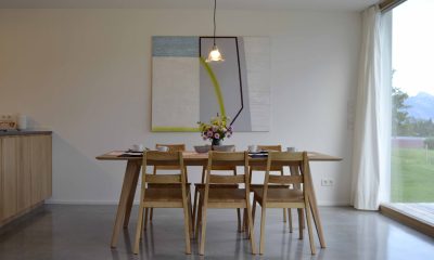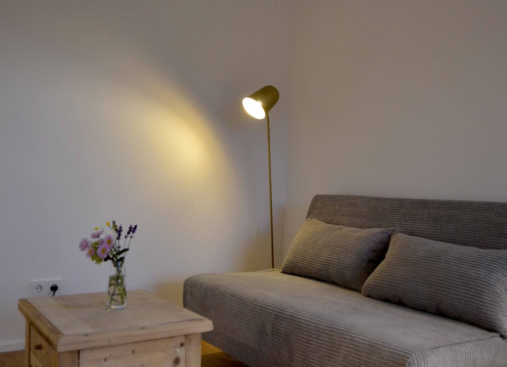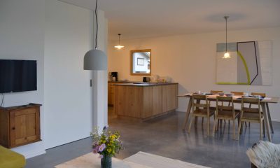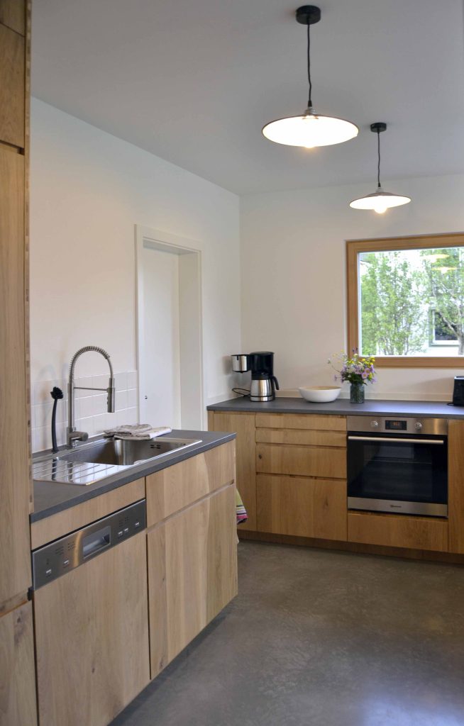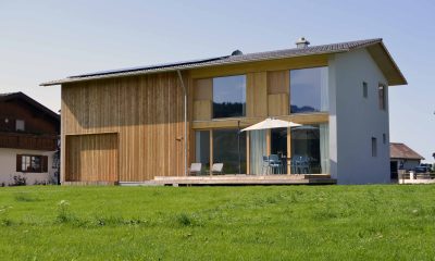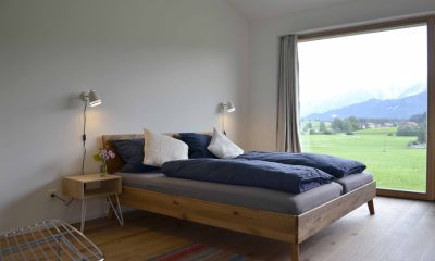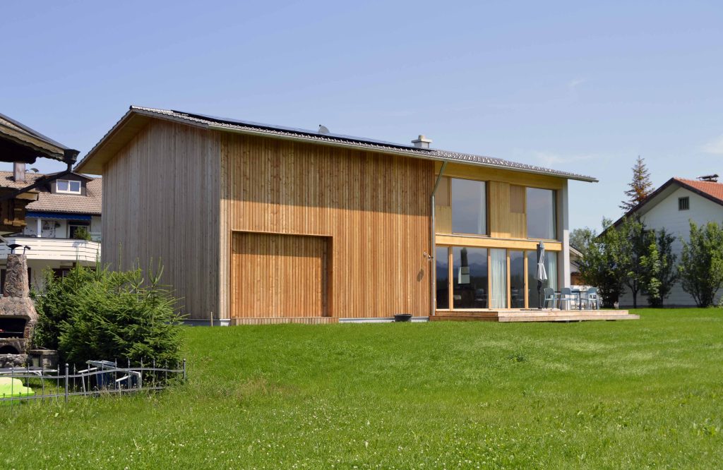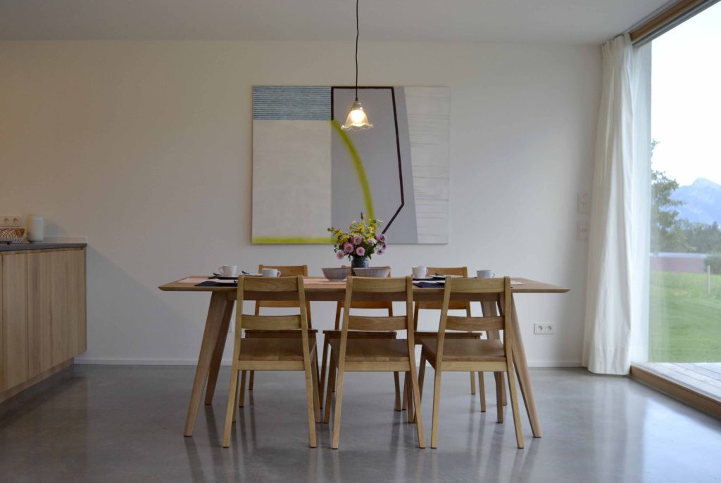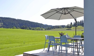 Moderne Architektur trifft traditionelle Allgäuer Baukultur! … Das ist das HAUS mit WEITBLICK. Das Ferienhaus mit zwei Etagen (110 m²) wird nur von Euch bewohnt und bietet Platz für bis zu sechs Personen. Die Räume sind stilvoll und mit Liebe zum Detail eingerichtet. Das Erdgeschoss verfügt über einen großzügigen Wohnbereich mit voll ausgestatteter Küche, einen Essbereich sowie einer Sofaecke. Auch ein kleiner Abstellraum und ein Gäste-WC sind vorhanden. Ein großes Panoramafenster über die gesamte Breite des Hauses eröffnet den Blick in die Landschaft und durchflutet den Raum mit Licht. Vorgelagert befinden sich eine große möblierte Sonnenterrasse und ein Garten. Im Obergeschoss sind zwei Schlafzimmer (ein Doppelzimmer und ein Zimmer mit Doppelbett und Schlafcouch), sowie ein Badezimmer mit Dusche, WC, Waschtisch und Waschmaschine vorhanden. Alle Räume sind mit Fußbodenheizung ausgestattet.